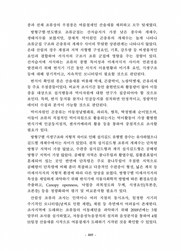469 종과 전체 조류상의 우점종은 여름철새인 산솔새를 제외하고 모두 텃새였다. 방형구별·연도별로 조류군집는 산지습지가 가장 낮은 종수와 개체수, 생태지수를 보였지만, 잠재적 먹이원인 곤충류의 개체수는 높게 나타나 조류군집 구조와 곤충류의 개체수 사이의 뚜렷한 상관관계는 나타나지 않았다. 온대 산림의 경우 계절과 지역 지형별 구성요인, 기후, 강우량 등 비생물적인 요인과 결합하여 서식지의 구조가 조류 군집에 영향을 주는 경향이 있다. 산지습지에 서식하는 조류의 종별 특이성과 미세서식지 사이의 연관성을 발견하기 위해 번식기 기간 동안 서식지 이용현황과 미기후 요인, 식생구조 등에 대해 장기적이고, 지속적인 모니터링이 필요할 것으로 판단된다. 번식이 확인된 종은 산솔새를 비롯해 박새, 곤줄박이, 노랑턱멧새, 큰...