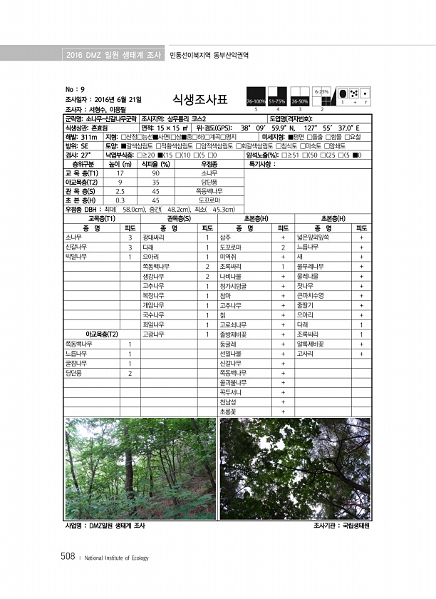 2016 DMZ 일원 생태계 조사 민통선이북지역 동부산악권역 508 ? National Institute of Ecology No 9 조사일자 2016년 6월 21일 조사자 서형수, 이응필 식생조사표 군락명소나무-신갈나무군락 조사지역상무룡리 코스2 도엽명 격자번호 식생상관혼효림 면적15 × 15 ㎡ 위·경도 GPS 38° 09′ 59.9″N, 127° 55′ 37.0″E 해발311m 지형□산정□능선■사면 □상■중□하 □계곡□평지 미세지형■평면 □돌출 □함몰 □요철 방위SE 토양■갈색삼림토 □적황색삼림토 □암적색삼림토 □회갈색삼림토 □침식토 □미숙토 □암쇄토 경사27° 낙엽부식층□≥20 ■ 15 □ 10 □ 5 □0 암석노출 % □≥51 □ 50 □ 25 □ 5 ■0 층위구분 높이 m 식피율 % 우점종 특기사...