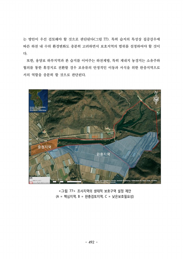 492 는 방안이 우선 검토해야 할 것으로 판단된다 그림 특히 습지의 특성상 집중강우에 77 따른 하천 내 수위 환경변화도 충분히 고려하면서 보호지역의 범위를 설정하여야 할 것이 다. 또한 용양보 하부지역과 본 습지를 이어주는 하천제방 특히 제내지 농경지는 소유주와 , , 협의를 통한 휴경지로 전환할 경우 포유류의 안정적인 이동과 서식을 위한 완충지역으로 서의 역할을 충분히 할 것으로 판단된다. 그림 77 조사지역의 생태적 보호구역 설정 제안 A = , B = 핵심지역 완충검토지역 낮은보호필요성 , C =