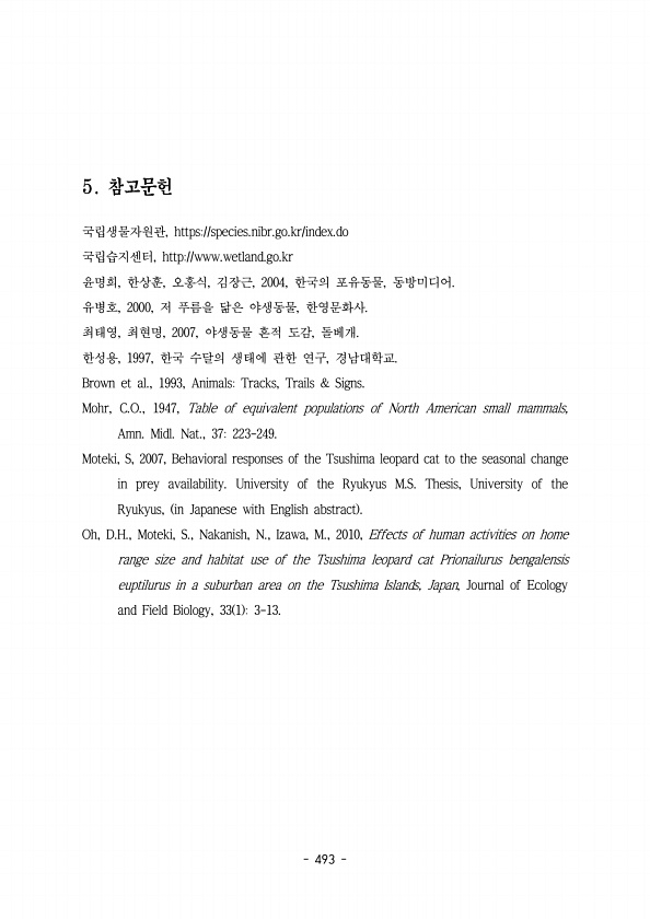 493 국립생물자원관, https//species.nibr.go.kr/index.do 국립습지센터, http//www.wetland.go.kr 윤명희 한상훈 오홍식 김장근 한국의 포유동물 동방미디어 , , , , 2004, , 유병호 저 푸름을 닮은 야생동물 한영문화사 , 2000, , 최태영 최현명 야생동물 흔적 도감 돌베개 , , 2007, , 한성용 한국 수달의 생태에 관한 연구 경남대학교 , 1997, , Brown et al., 1993, AnimalsTracks, Trails & Signs. Mohr, C.O., 1947, Table of equivalent populations of North American small mammals, Amn. Midl. Nat., 37223-249. Motek...