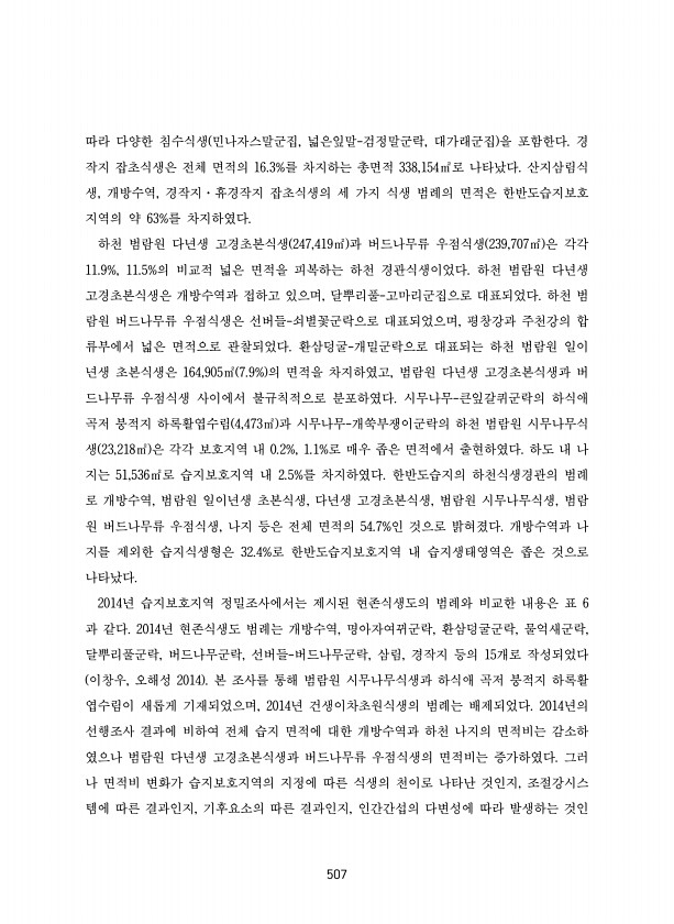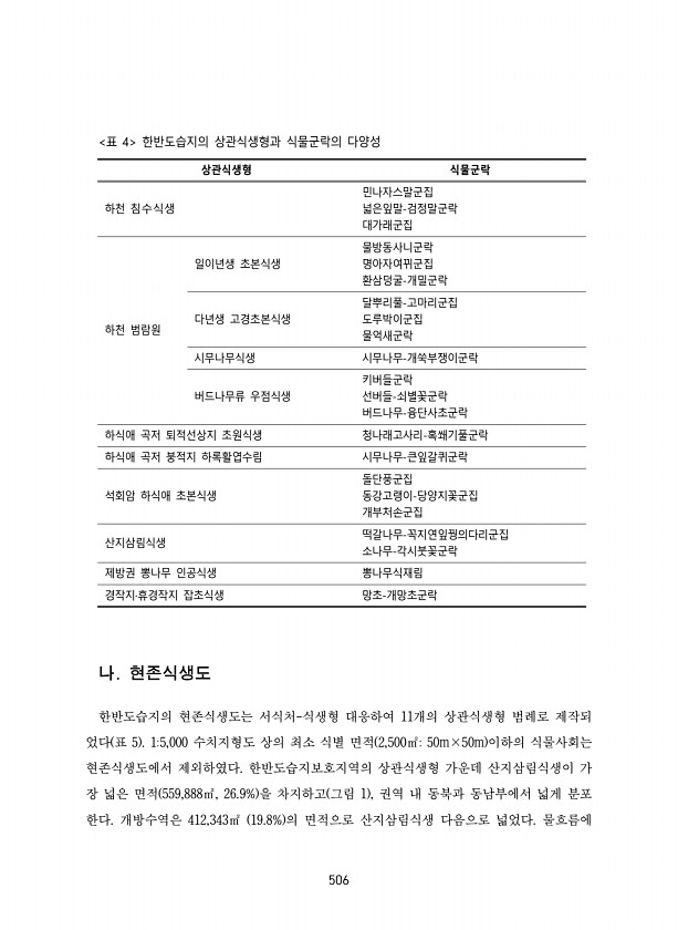 506 상관식생형 식물군락 하천 침수식생 민나자스말군집 넓은잎말-검정말군락 대가래군집 하천 범람원 일이년생 초본식생 물방동사니군락 명아자여뀌군집 환삼덩굴-개밀군락 다년생 고경초본식생 달뿌리풀-고마리군집 도루박이군집 물억새군락 시무나무식생 시무나무-개쑥부쟁이군락 버드나무류 우점식생 키버들군락 선버들-쇠별꽃군락 버드나무-융단사초군락 하식애 곡저 퇴적선상지 초원식생 청나래고사리-혹쐐기풀군락 하식애 곡저 붕적지 하록활엽수림 시무나무-큰잎갈퀴군락 석회암 하식애 초본식생 돌단풍군집 동강고랭이-당양지꽃군집 개부처손군집 산지삼림식생 떡갈나무-꼭지연잎꿩의다리군집 소나무-각시붓꽃군락 제방권 뽕나무 인공식생 뽕나무식재림 경작지·휴경작지 잡초식생 망초-개망초군락 표 4 한반도습지의 상관식생형과 식물군락의 다양성 나. 현존식생도 ...
