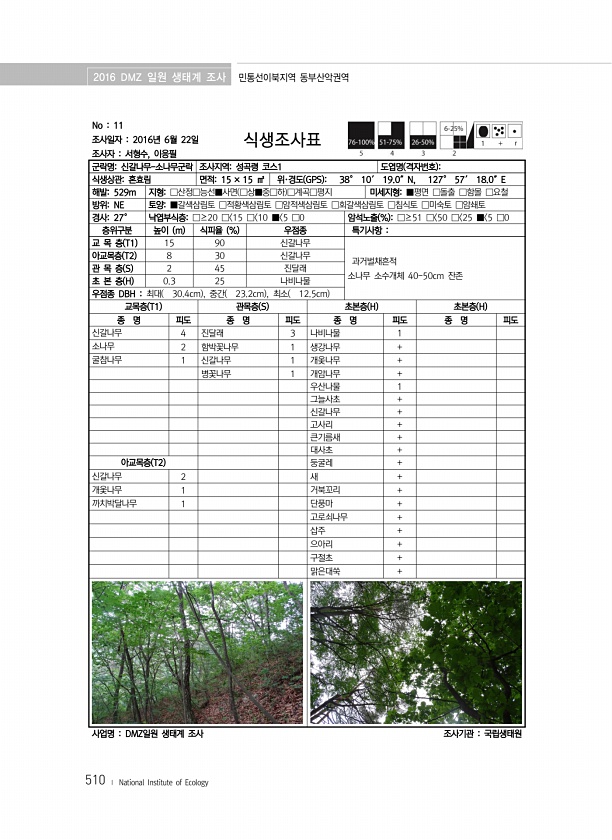 2016 DMZ 일원 생태계 조사 민통선이북지역 동부산악권역 510 ? National Institute of Ecology No 11 조사일자 2016년 6월 22일 조사자 서형수, 이응필 식생조사표 군락명신갈나무-소나무군락 조사지역성곡령 코스1 도엽명 격자번호 식생상관혼효림 면적15 × 15 ㎡ 위·경도 GPS 38° 10′ 19.0″N, 127° 57′ 18.0″E 해발529m 지형□산정□능선■사면 □상■중□하 □계곡□평지 미세지형■평면 □돌출 □함몰 □요철 방위NE 토양■갈색삼림토 □적황색삼림토 □암적색삼림토 □회갈색삼림토 □침식토 □미숙토 □암쇄토 경사27° 낙엽부식층□≥20 □ 15 □ 10 ■ 5 □0 암석노출 % □≥51 □ 50 □ 25 ■ 5 □0 층위구분 높이 m 식피율 % 우점종 특기사...