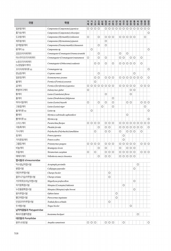 518 일본왕개미 Camponotus Camponotus japonicus ○ ○ ○ ○ ○ ○ ○ ○ ○ ○ ○ ○ ○ ○ ○ ○ ○ 홍가슴개미 Camponotus Camponotus obscuripes ○ 도쿄왕개미 Camponotus Myrmamblys tokioensis ○ ○ ○ ○ ○ ○ ○ ○ ○ ○ ○ 제주왕개미 Camponotus Myrmentoma jejuensis ○ 갈색발왕개미 Camponotus Paramyrmamblys kiusuensis ○ ○ 왕개미 sp. Camponotus sp. ○ ○ 검정꼬리치레개미 Crematogaster Crematogaster brunnea teranishii ○ ○ ○ 마쓰무라꼬리치레개미 Crematogaster Crematogaster matsum...