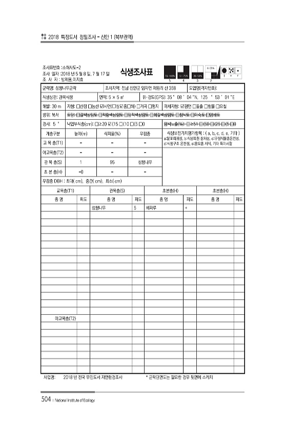 2018 특정도서 정밀조사 신안 1 북부권역 504 ? National Institute of Ecology 조사표번호 소허사도-2 조사 일자 2018 년 5 월 8 일, 7 월 17 일 조 사 자 방제용,이지효 식생조사표 군락명섬향나무군락 조사지역전남 신안군 임자면 재원리 산 358 도엽명 격자번호 식생상관관목식생 면적5 × 5 ㎡ 위·경도 GPS 35 ° 08 ′ 04 ″N, 125 ° 53 ′ 01 ″E 해발30 m 지형□산정 □능선 ?사면 ?상?중□하 □계곡 □평지 미세지형?평면 □돌출 □함몰 □요철 방위북서 토양□갈색삼림토 □적황색삼림토 □암적색삼림토 □회갈색삼림토 □침식토 □미숙토 □암쇄토 경사5 ° 낙엽부식층 cm □≥20 ? 15 □ 10 □ 5 □0 암석노출 % □≥51 □〈50 □〈25 □...