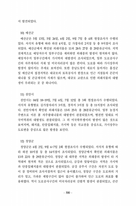 500 서 발견되었다. 10 예산군 예산군은 5월 13일, 5월 26일, 6월 2일, 9월 7일 총 4회 현장조사가 수행되 었다. 서식처 유형에 따라 하천 4지점, 길 가장자리 2지점 등 총 9지점이 조사 되었다. 예산군에서 확인된 외래식물은 11과 28속 27종 총 29분류군이다. 지역 전체적으로 예당저수지 일부구간을 제외하면 외래종의 발생이 현저하지 않다. 예당저수지 일부구간에서 가시박의 대발생이 조사되었으며, 일부 도로공사구 간의 자주개자리 식재 및 미국자리공이 많은 편이다. 도로를 따라 가시상추의 발생이 많아지는 추세로 보여진다. 또한 충남도청이 새로이 들어서는 홍성군 및 예산군의 접경지역은 대규모의 토목공사가 한창으로 인근 지점들의 끈끈이 대나물 및 큰금계국의 식재가 많으며, 대규모 교란으로 인한 ...
