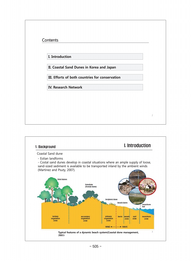 1. Background I. Introduction Coastal Sand dune Eolian landforms Costal sand dunes develop in coastal situations where an ample supply of loose, sand-sized sediment is available to be transported inland by the ambient winds Martinez and Psuty, 2007 Typical features of a dynamic beach system Coastal done management, 3 2001 Contents II. Coastal Sand Dunes in Korea and Japan I. Introduction III. Effo...