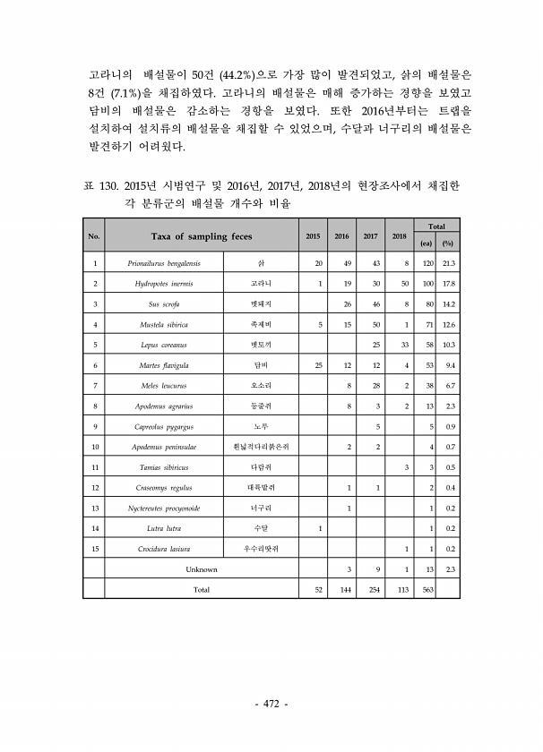 472 고라니의 배설물이 50건 44.2% 으로 가장 많이 발견되었고, 삵의 배설물은 8건 7.1% 을 채집하였다. 고라니의 배설물은 매해 증가하는 경향을 보였고 담비의 배설물은 감소하는 경항을 보였다. 또한 2016년부터는 트랩을 설치하여 설치류의 배설물을 채집할 수 있었으며, 수달과 너구리의 배설물은 발견하기 어려웠다. No. Taxa of sampling feces 2015 2016 2017 2018 Total ea % 1 Prionailurus bengalensis 삵 20 49 43 8 120 21.3 2 Hydropotes inermis 고라니 1 19 30 50 100 17.8 3 Sus scrofa 멧돼지 26 46 8 80 14.2 4 Mustela sibirica 족제비 5 15 50 1 ...