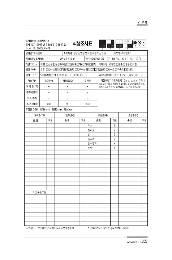 V. 부 록 www.nie.re.kr ?505 조사표번호 소허사도-3 조사 일자 2018 년 5 월 8 일, 7 월 17 일 조 사 자 방제용,이지효 식생조사표 군락명억새군락 조사지역전남 신안군 임자면 재원리 산 358 도엽명 격자번호 식생상관초지식생 면적5 × 5 ㎡ 위·경도 GPS 35 ° 07 ′ 58 ″N, 125 ° 53 ′ 09 ″E 해발35 m 지형□산정 □능선 ?사면 ?상?중□하 □계곡 □평지 미세지형?평면 □돌출 □함몰 □요철 방위북동 토양□갈색삼림토 □적황색삼림토 □암적색삼림토 □회갈색삼림토 □침식토 □미숙토 □암쇄토 경사5 ° 낙엽부식층 cm □≥20 ? 15 □ 10 □ 5 □0 암석노출 % □≥51 □〈50 □〈25 □〈5 □0 계층구분 높이 m 식피율 % 우점종 식생보전가치평가항목 ...