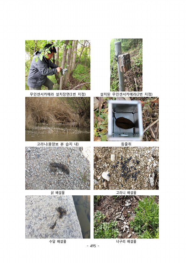 495 무인센서카메라 설치장면 번 지점 1 설치된 무인센서카메라 번 지점 2 고라니 용양보 본 습지 내 등줄쥐 삵 배설물 고라니 배설물 수달 배설물 너구리배설물