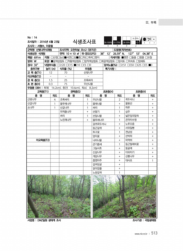 Ⅲ. 부록 www.nie.re.kr ? 513 No 14 조사일자 2016년 6월 23일 조사자 서형수, 이응필 식생조사표 군락명산벚나무식재림 조사지역오천터널 코스2 양구군 도엽명 격자번호 식생상관식재림 면적10 × 10 ㎡ 위·경도 GPS 38° 12′ 26.59″N, 127° 53′ 04.38″E 해발691m 지형□산정□능선■사면 □상■중□하 □계곡□평지 미세지형■평면 □돌출 □함몰 □요철 방위W 토양■갈색삼림토 □적황색삼림토 □암적색삼림토 □회갈색삼림토 □침식토 □미숙토 □암쇄토 경사32° 낙엽부식층□≥20 □ 15 ■ 10 □ 5 □0 암석노출 % □≥51 □ 50 □ 25 □ 5 ■0 층위구분 높이 m 식피율 % 우점종 특기사항 교 목 층 T1 12 70 산벚나무 아교목층 T2 관 목 층 S 1.5...