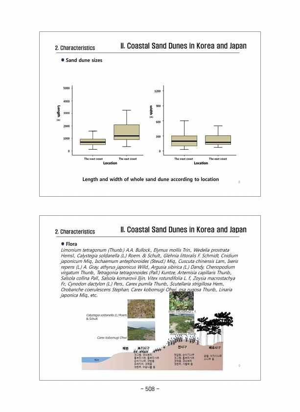 2. Characteristics II. Coastal Sand Dunes in Korea and Japan Limonium tetragonum Thunb. A.A. Bullock., Elymus mollis Trin., Wedelia prostrata Hemsl., Calystegia soldanella L. Roem. & Schult., Glehnia littoralis F. Schmidt, Cnidium japonicum Miq., Ischaemum antephoroides Steud. Miq., Cuscuta chinensis Lam., Ixeris repens L. A. Gray, athyrus japonicus Willd., Argusia sibirica L. Dandy, Chenopodium v...
