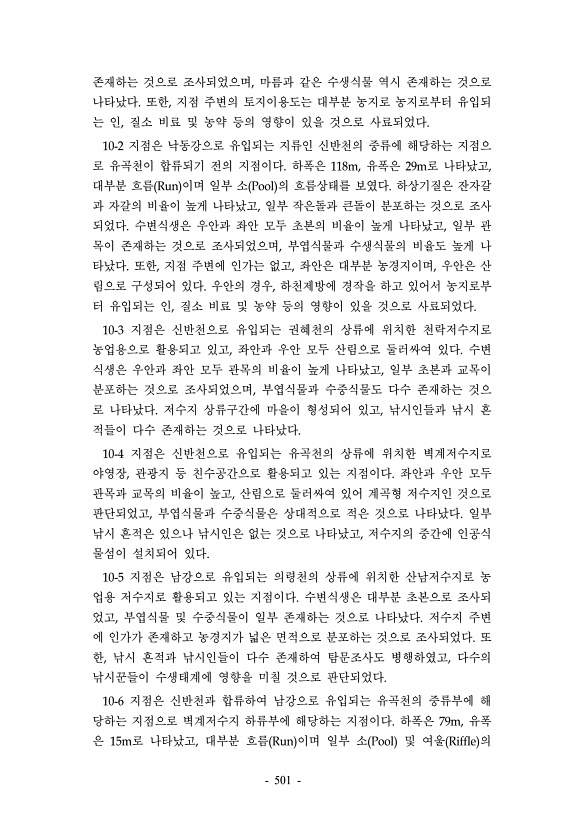 존재하는 것으로 조사되었으며, 마름과 같은 수생식물 역시 존재하는 것으로 나타났다. 또한, 지점 주변의 토지이용도는 대부분 농지로 농지로부터 유입되 는 인, 질소 비료 및 농약 등의 영향이 있을 것으로 사료되었다. 10-2 지점은 낙동강으로 유입되는 지류인 신반천의 중류에 해당하는 지점으 로 유곡천이 합류되기 전의 지점이다. 하폭은 118m, 유폭은 29m로 나타났고, 대부분 흐름 Run 이며 일부 소 Pool 의 흐름상태를 보였다. 하상기질은 잔자갈 과 자갈의 비율이 높게 나타났고, 일부 작은돌과 큰돌이 분포하는 것으로 조사 되었다. 수변식생은 우안과 좌안 모두 초본의 비율이 높게 나타났고, 일부 관 목이 존재하는 것으로 조사되었으며, 부엽식물과 수생식물의 비율도 높게 나 타났다. 또한, 지점 주변에 인가...