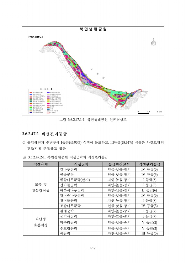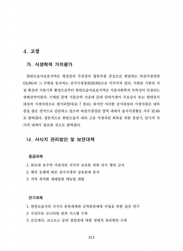 513 4. 고찰 가. 식생학적 가치평가 한반도습지보호지역은 평창강과 주천강의 합류부를 중심으로 발달하는 하천식생경관 54.9% 과 그 주변을 둘러싸는 산지식생경관 26.9% 으로 이루어져 있다. 석회암 기반의 지 질 환경과 식물기후 환경으로부터 한반도습지보호지역은 식물사회학적 독특성이 인정되는 생태권역이었다. 기재된 22개 식물군락 가운데 15개 단위식생이 주요감시 또는 절대감시 대상의 식생자원으로 평가되었다 표 7 참조 하지만 이러한 감시대상의 식생자원은 대부 분을 좁은 면적으로 잔존하고 있으며 하천식생경관 영역 내에서 습지식생형은 겨우 32.4% 로 밝혀졌다. 결론적으로 한반도습지 내의 고유 식생자원 회복을 위한 중장기, 단기적 국 가적 대책이 필요한 것으로 밝혀졌다. 나. 서식지 관리방안 및 보전대책...