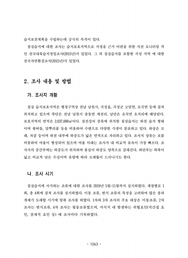 1263 습지보전계획을 수립하는데 궁극의 목적이 있다. 침실습지에 대한 조사는 습지보호지역으로 지정을 근거 마련을 위한 사전 모니터링 격 인 전국내륙습지정밀조사 2015년 가 있었다. 그 외 침실습지를 포함한 곡성 지역 에 대한 전국자연환경조사 2015년 가 있었다. 2. 조사 내용 및 방법 가. 조사지 개황 침실 습지보호지역은 행정구역상 전남 남원시, 곡성읍, 곡성군 고달면, 오곡면 등에 걸쳐 위치하고 있으며 북단은 전남 남원시 송동면 세전리, 남단은 오곡면 오지리에 해당된다. 보호지역의 면적은 2,037,000㎡이다. 섬진강의 중류에 위치한 침실습지는 하천 습지 형태 이며 왕버들, 달뿌리풀 등을 비롯하여 수변으로 다양한 식생이 분포하고 있다. 하상은 모 래, 자갈 등이며 하천 내부에 하중도가 넓은 면적으...