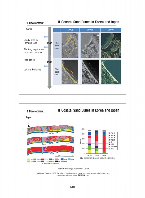 3. Development II. Coastal Sand Dunes in Korea and Japan Japan 13 Landuse change in Shonan Coast referenceOka et al., 2008, The effect of development on clastal sand dune vegetation in Shonan coast, Kanagawa Prefecture, Japan, 景?生態? 14 2 3. Development II. Coastal Sand Dunes in Korea and Japan 1960 Planting vegetation to erosion control Sandy area or Farming land .. Korea 1970s 1990s 2000s The wes...