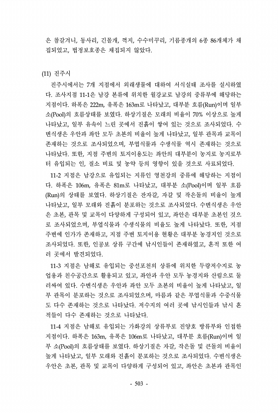 은 참갈겨니, 동사리, 긴몰개, 꺽지, 수수미꾸리, 기름종개의 6종 86개체가 채 집되었고, 법정보호종은 채집되지 않았다. 11 진주시 진주시에서는 7개 지점에서 외래생물에 대하여 서식실태 조사를 실시하였 다. 조사지점 11-1은 남강 본류에 위치한 월강교로 남강의 중류부에 해당하는 지점이다. 하폭은 222m, 유폭은 163m로 나타났고, 대부분 흐름 Run 이며 일부 소 Pool 의 흐름상태를 보였다. 하상기질은 모래의 비율이 70% 이상으로 높게 나타났고, 일부 유속이 느린 곳에서 진흙이 쌓여 있는 것으로 조사되었다. 수 변식생은 우안과 좌안 모두 초본의 비율이 높게 나타났고, 일부 관목과 교목이 존재하는 것으로 조사되었으며, 부엽식물과 수생식물 역시 존재하는 것으로 나타났다. 또한, 지점 주변의 토지이...