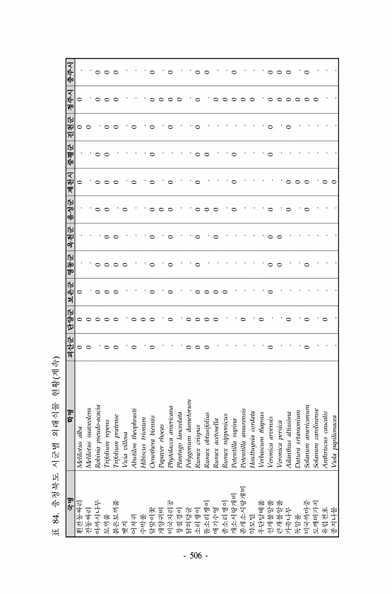 표 84. 충청북도 시군별 외래식물 현황 계속 국명 학명 괴산군 단양군 보은군 영동군 옥천군 음성군 제천시 증평군 진천군 청주시 충주시 흰전동싸리 Melilotus alba 0 0 0 0 0 0 전동싸리 Melilotus suaveolens 0 0 0 아까시나무 Robinia pseudo-acacia 0 0 0 0 0 0 0 0 토끼풀 Trifolium repens 0 0 0 0 0 0 0 0 0 0 0 붉은토끼풀 Trifolium pratense 0 0 0 0 0 0 0 0 0 벳지 Vicia villosa 0 0 어저귀 Abutilon theophrasti 0 0 0 0 수박풀 Hibiscus trionum 0 달맞이꽃 Oenothera biennis 0 0 0 0 0 0 0 0 0 0 0 개양귀비 Pa...