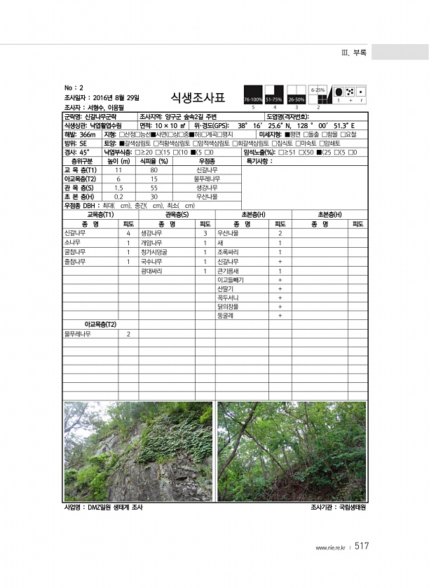 Ⅲ. 부록 www.nie.re.kr ? 517 No 2 조사일자 2016년 8월 29일 조사자 서형수, 이응필 식생조사표 군락명신갈나무군락 조사지역양구군 숲속2길 주변 도엽명 격자번호 식생상관낙엽활엽수림 면적10 × 10 ㎡ 위·경도 GPS 38° 16′ 25.6″N, 128 ° 00′ 51.3″E 해발366m 지형□산정□능선■사면 □상□중■하 □계곡□평지 미세지형■평면 □돌출 □함몰 □요철 방위SE 토양■갈색삼림토 □적황색삼림토 □암적색삼림토 □회갈색삼림토 □침식토 □미숙토 □암쇄토 경사45° 낙엽부식층□≥20 □ 15 □ 10 ■ 5 □0 암석노출 % □≥51 □ 50 ■ 25 □ 5 □0 층위구분 높이 m 식피율 % 우점종 특기사항 교 목 층 T1 11 80 신갈나무 아교목층 T2 6 15 물푸레나무 ...