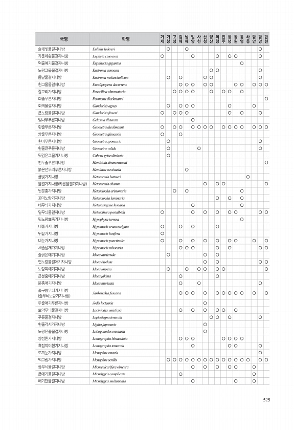 525 솔개빛물결자나방 Eulithis ledereri ○ ○ ○ 가운데흰물결자나방 Euphyia cineraria ○ ○ ○ ○ ○ ○ 먹줄애기물결자나방 Eupithecia gigantea ○ 노랑그물물결자나방 Eustroma aerosum ○ ○ ○ 톱날물결자나방 Eustroma melancholicum ○ ○ ○ ○ ○ 흰그물물결자나방 Evecliptopera decurrens ○ ○ ○ ○ ○ ○ ○ ○ ○ ○ 갈고리가지나방 Fascellina chromataria ○ ○ ○ ○ ○ ○ ○ ○ 희줄푸른자나방 Feometra dieckmanni ○ 회색물결자나방 Gandaritis agnes ○ ○ ○ ○ ○ ○ 큰노랑물결자나방 Gandaritis fxseni ○ ○ ○ ○ ○ ○ ○ 벚나무푸른자나방 ...