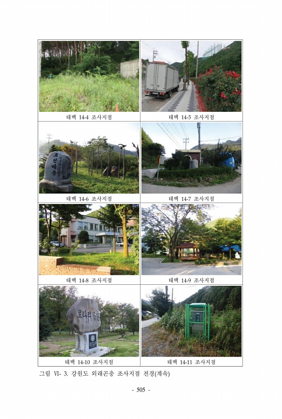 507 1 괴산군 괴산군은 1차 조사 2016년 6월 19일 1일간 과 2차 조사 2016년 9월 20일 1일 간 로 2차례에 걸쳐서 현장조사가 수행되었다. 서식처 유형에 따라 하천 7지 점, 길가 6지점 등 17지점이 조사되었다. 괴산군 조사결과 확인된 외래식물은 14과 35속 46분류군이다. 괴산군에서 조사된 외래식물은 달맞이꽃 10지점 괴산 -1, 5, 6, 7, 8, 9, 10, 13, 15, 16 , 다닥냉이 8지점 괴산-1, 2, 6, 8, 10, 12, 13, 15 , 소리쟁이 8지점 괴산-5, 6, 7, 8, 9, 10, 12, 13 , 지느러미엉겅퀴 7지점 괴산 -1, 4, 8, 12, 13, 14, 15 , 선개불알풀 7지점 괴산-1, 4, 10, 12, 13, 14, 15 , 생태 계교란...