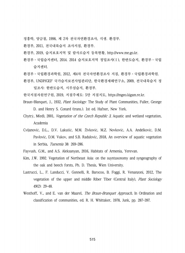 515 정흥락, 양금철, 1998, 제 2차 전국자연환경조사, 식생. 환경부. 환경부, 2011, 전국내륙습지 조사지침, 환경부. 환경부, 2019, 습지보호지역 및 람사르습지 등록현황, http//www.me.go.kr. 환경부·국립습지센터, 2014. 2014 습지보호지역 정밀조사 Ⅰ , 한반도습지, 환경부·국립 습지센터. 환경부·국립환경과학원, 2012, 제4차 전국자연환경조사 지침, 환경부·국립환경과학원. 환경부, UNDP/GEF 국가습지보전사업관리단, 한국환경재해연구소, 2009, 전국내륙습지 정 밀조사한반도습지, 시루섬습지, 환경부. 한국지질자원연구원, 2019, 지질주제도5만 지질지도, https//mgeo.kigam.re.kr. Braun-Blanquet, J., 1932, Plant Soci...