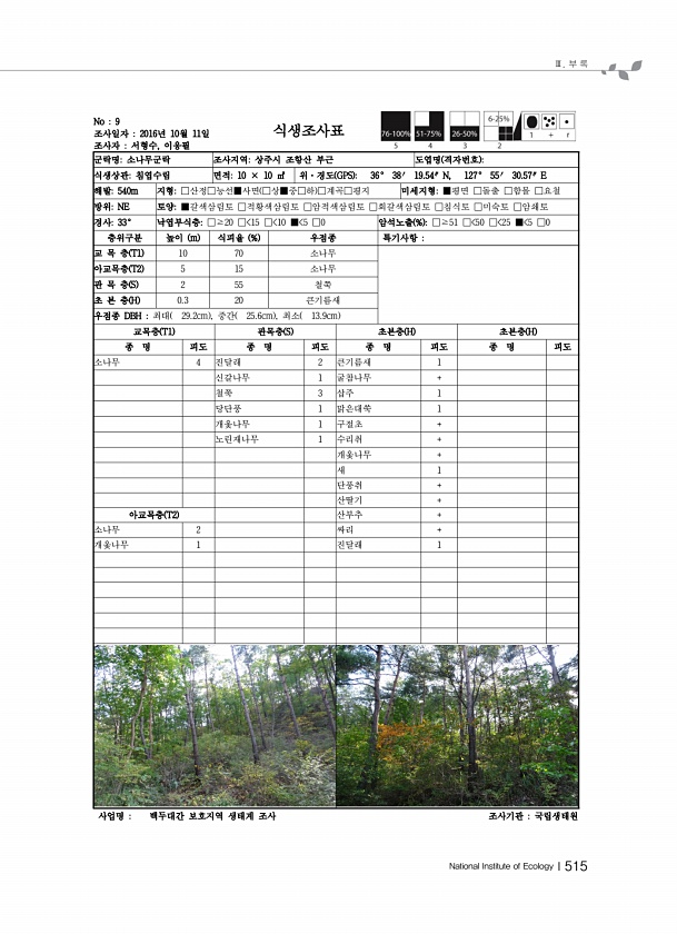 Ⅲ. 부 록 National Institute of EcologyⅠ515 No 9 조사일자 2016년 10월 11일 조사자 서형수, 이응필 식생조사표 군락명소나무군락 조사지역상주시 조항산 부근 도엽명 격자번호 식생상관침엽수림 면적10 × 10 ㎡ 위·경도 GPS 36° 38′ 19.54″ N, 127° 55′ 30.57″ E 해발540m 지형□산정□능선■사면 □상■중□하 □계곡□평지 미세지형■평면 □돌출 □함몰 □요철 방위NE 토양■갈색삼림토 □적황색삼림토 □암적색삼림토 □회갈색삼림토 □침식토 □미숙토 □암쇄토 경사33° 낙엽부식층□≥20 □ 15 □ 10 ■ 5 □0 암석노출 % □≥51 □ 50 □ 25 ■ 5 □0 층위구분 높이 m 식피율 % 우점종 특기사항 교 목 층 T1 10 70 소나무 아교목층 ...