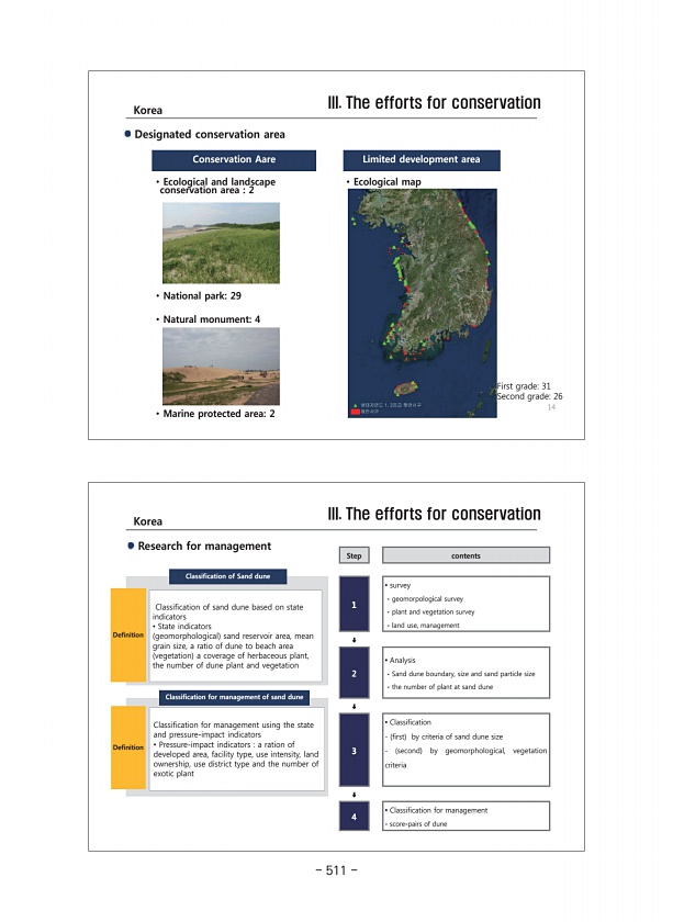Research for management Step contents 1 ? survey geomorpological survey plant and vegetation survey land use, management ? 2 ? Analysis Sand dune boundary, size and sand particle size the number of plant at sand dune Classification of Sand dune Definition Classification of sand dune based on state indicators ? State indicators geomorphological sand reservoir area, mean grain size, a ratio of dune ...