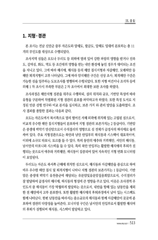 III. 종 합 www.nie.re.kr ?513 1. · 본 조사는 전남 신안군 중부 자은도와 암태도, 팔금도, 압해도 일대에 분포하는 총 11 개의 무인도를 대상으로 수행되었다. 조사지역 섬들은 오도나 두리도 등 외해에 열려 있어 강한 파랑의 영향을 받거나 진목 도, 갈매섬, 화도, 역도 등 조간대의 영향을 받는 내만 환경에 놓인 경우가 대비되는 조건 을 지니고 있다. 그에 따라 해식애, 해식동 등의 해안 침식지형과 자갈해안, 모래해안 등 해안 퇴적지형이 고루 나타났다. 그에 따라 암석해안 구간은 선상 조사, 퇴적해안 구간은 가능한 섬을 일주하는 도보조사를 병행하며 수행되었다. 또한 지형 여건이나 조석차 등에 의해 1 차 조사시 부족한 부분은 2 차 조사에서 최대한 보완 조사를 하였다. 조사과정은 해안지...