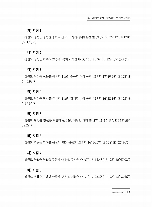 x. 동강유역 생태·경관보전지역의 담수어류 www.nie.re.kr ?513 1 강원도 정선군 정선읍 광하리 산 251, 동강생태체험장 앞 N 37° 21′29.17″, E 128° 37′17.32″ 2 강원도 정선군 가수리 203-1, 북대교 하방 N 37° 18′45.02″, E 128° 37′35.83″ 3 강원도 정선군 신동읍 운치리 1165, 수동길 다리 하방 N 37° 17′49.45″, E 128° 3 6′36.98″ 4 강원도 정선군 정선읍 운치리 1165, 점재길 다리 하방 N 37° 16′28.15″, E 128° 3 6′34.36″ 5 강원도 정선군 정선읍 덕천리 산 159, 제장길 다리 N 37° 15′57.18″, E 128° 35′ 08.22″ 6 강원도 영월군 영월읍 문산리 785...