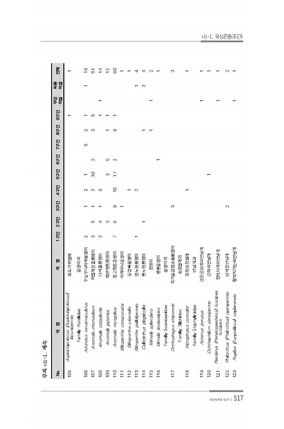 517 No. 학 명 국 명 1구간 2구간 3구간 4구간 5구간 6구간 7구간 8구간 9구간 무섬 마을 회룡 마을 전체 105 Aspidobyctiscus Aspidobyctiscus lacunipennis 포도거위벌레 1 1 Family Rutelidae 풍뎅이과 106 Adoretus tenuimaculatus 주둥무늬차색풍뎅이 2 1 2 1 5 2 1 1 15 107 Anomala chamaeleon 카멜레온줄풍뎅이 3 5 1 2 30 2 3 5 51 108 Anomala corpulenta 다색줄풍뎅이 2 4 1 5 1 1 14 109 Anomala japonica 해변청동풍뎅이 2 3 5 1 1 12 110 Anomala mongolica 몽고청동풍뎅이 7 6 9 10 17 2 8 1 60 111 ...