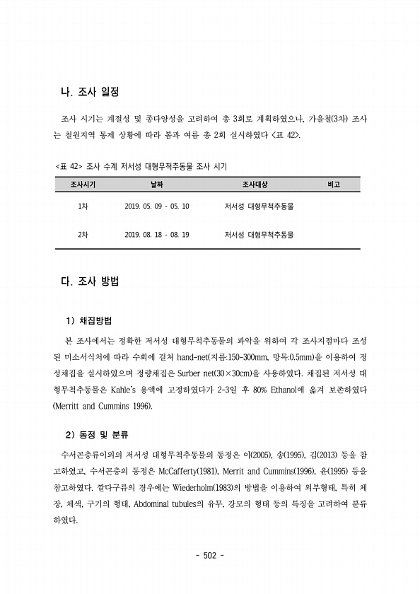 502 조사 시기는 계절성 및 종다양성을 고려하여 총 회로 계획하였으나 가을철 차 조사 3 , 3 는 철원지역 통제 상황에 따라 봄과 여름 총 회 실시하였다 표 2 42 조사시기 날짜 조사대상 비고 차1 2019. 05. 09 05. 10 저서성 대형무척추동물 차2 2019. 08. 18 08. 19 저서성 대형무척추동물 표 42 조사 수계 저서성 대형무척추동물 조사 시기 본 조사에서는 정확한 저서성 대형무척추동물의 파악을 위하여 각 조사지점마다 조성 된 미소서식처에 따라 수회에 걸쳐 지름 hand-net 150-300mm, 0.5mm 망목 을 이용하여 정 성채집을 실시하였으며 정량채집은 Surber net 30×30cm 을 사용하였다 채집된 저서성 대 형무척추동물은 용액에 고정하였다가 일 후 Kahles ...