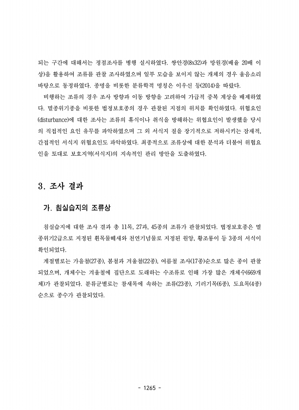 1265 되는 구간에 대해서는 정점조사를 병행 실시하였다. 쌍안경 8x32 과 망원경 배율 20배 이 상 을 활용하여 조류를 관찰 조사하였으며 일부 모습을 보이지 않는 개체의 경우 울음소리 바탕으로 동정하였다. 종명을 비롯한 분류학적 명칭은 이우신 등 2014 을 따랐다. 비행하는 조류의 경우 조사 방향과 이동 방향을 고려하여 가급적 중복 계상을 배제하였 다. 멸종위기종을 비롯한 법정보호종의 경우 관찰된 지점의 위치를 확인하였다. 위협요인 disturbance 에 대한 조사는 조류의 휴식이나 취식을 방해하는 위협요인이 발생했을 당시 의 직접적인 요인 유무를 파악하였으며 그 외 서식지 질을 장기적으로 저하시키는 잠재적, 간접적인 서식지 위협요인도 파악하였다. 최종적으로 조류상에 대한 분석과 더불어 위협요 인을...