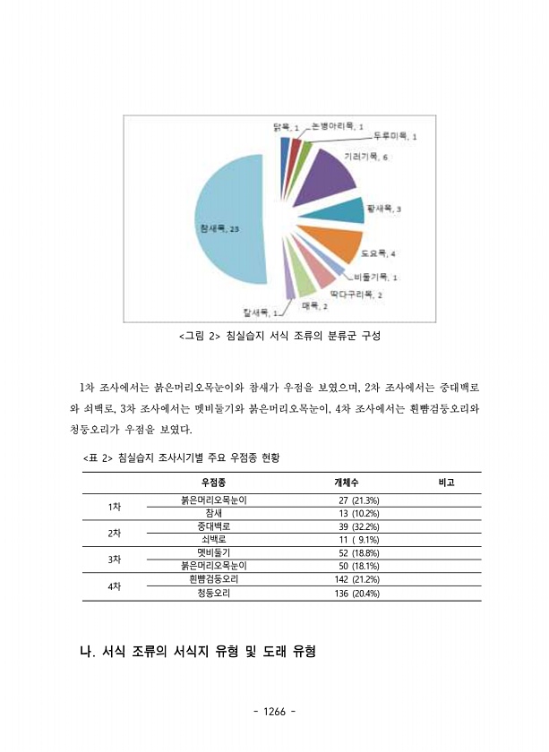1266 그림 2 침실습지 서식 조류의 분류군 구성 1차 조사에서는 붉은머리오목눈이와 참새가 우점을 보였으며, 2차 조사에서는 중대백로 와 쇠백로, 3차 조사에서는 멧비둘기와 붉은머리오목눈이, 4차 조사에서는 흰뺨검둥오리와 청둥오리가 우점을 보였다. 우점종 개체수 비고 1차 붉은머리오목눈이 27 21.3% 참새 13 10.2% 2차 중대백로 39 32.2% 쇠백로 11 9.1% 3차 멧비둘기 52 18.8% 붉은머리오목눈이 50 18.1% 4차 흰뺨검둥오리 142 21.2% 청둥오리 136 20.4% 표 2 침실습지 조사시기별 주요 우점종 현황 나. 서식 조류의 서식지 유형 및 도래유형