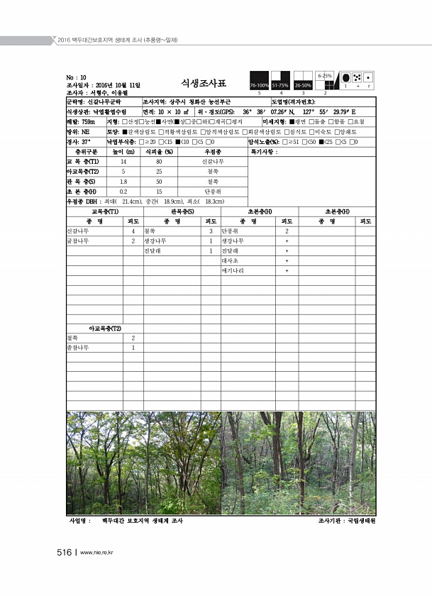 2016 백두대간보호지역 생태계 조사 추풍령밀재 516Ⅰwww.nie.re.kr No 10 조사일자 2016년 10월 11일 조사자 서형수, 이응필 식생조사표 군락명신갈나무군락 조사지역상주시 청화산 능선부근 도엽명 격자번호 식생상관낙엽활엽수림 면적10 × 10 ㎡ 위·경도 GPS 36° 38′ 07.26″ N, 127° 55′ 29.79″ E 해발759m 지형□산정□능선■사면 ■상□중□하 □계곡□평지 미세지형■평면 □돌출 □함몰 □요철 방위NE 토양■갈색삼림토 □적황색삼림토 □암적색삼림토 □회갈색삼림토 □침식토 □미숙토 □암쇄토 경사37° 낙엽부식층□≥20 □ 15 ■ 10 □ 5 □0 암석노출 % □≥51 □ 50 ■ 25 □ 5 □0 층위구분 높이 m 식피율 % 우점종 특기사항 교 목 층 T1 14 80...