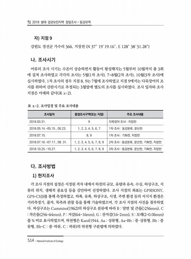 2018 생태·경관보전지역 정밀조사 동강유역 514 ? National Institute of Ecology 9 강원도 정선군 가수리 366, 지장천 N 37° 19′19.16″, E 128° 38′31.28″ 어류의 조사 시기는 수온이 상승하면서 활동이 왕성해지는 5월부터 10월까지 총 3회 에 걸쳐 조사하였고 각각의 조사는 5월 1차 조사 , 78월 2차 조사 , 10월 3차 조사 에 실시하였다. 1차 조사의 경우 지점 8, 9는 7월에 조사하였고 지점 9에서는 다묵장어의 조 사를 위하여 산란시기로 추정되는 3월말에 별도의 조사를 실시하였다. 조사 일자와 조사 지점은 아래와 같다 표 x-2 조사일자 중점조사구역 또는 지점 주요 조사내용 2018.03.31. 9 다묵장어 조사 지장천 2018.05.14.0...