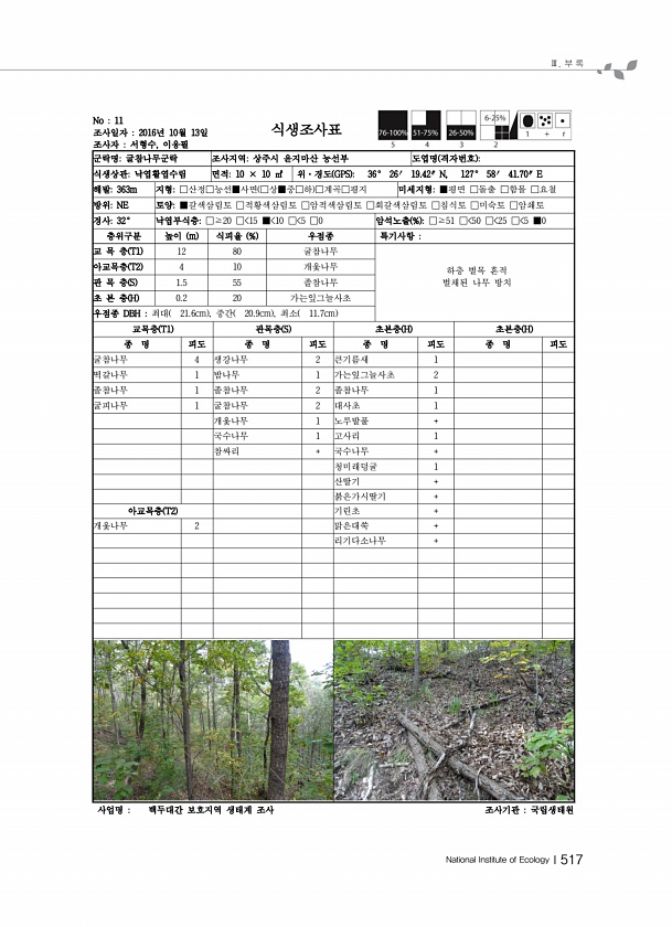 Ⅲ. 부 록 National Institute of EcologyⅠ517 No 11 조사일자 2016년 10월 13일 조사자 서형수, 이응필 식생조사표 군락명굴참나무군락 조사지역상주시 윤지마산 능선부 도엽명 격자번호 식생상관낙엽활엽수림 면적10 × 10 ㎡ 위·경도 GPS 36° 26′ 19.42″ N, 127° 58′ 41.70″ E 해발363m 지형□산정□능선■사면 □상■중□하 □계곡□평지 미세지형■평면 □돌출 □함몰 □요철 방위NE 토양■갈색삼림토 □적황색삼림토 □암적색삼림토 □회갈색삼림토 □침식토 □미숙토 □암쇄토 경사32° 낙엽부식층□≥20 □ 15 ■ 10 □ 5 □0 암석노출 % □≥51 □ 50 □ 25 □ 5 ■0 층위구분 높이 m 식피율 % 우점종 특기사항 교 목 층 T1 12 80 굴참나...