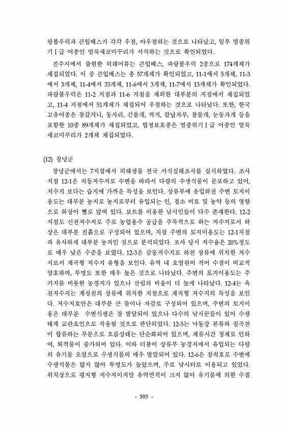 랑볼우럭과 큰입배스가 각각 우점, 아우점하는 것으로 나타났고, 일부 멸종위 기Ⅰ급 어종인 얼룩새코미꾸리가 서식하는 것으로 확인되었다. 진주시에서 출현한 외래어류는 큰입배스, 파랑볼우럭 2종으로 174개체가 채집되었다. 이 중 큰입배스는 총 57개체가 확인되었고, 11-1에서 5개체, 11-3 에서 3개체, 11-4에서 33개체, 11-6에서 3개체, 11-7에서 13개체가 확인되었다. 파랑볼우럭은 11-2 지점과 11-6 지점을 제외한 대부분의 지점에서 채집되었 고, 11-4 지점에서 51개체가 채집되어 우점하는 것으로 나타났다. 또한, 한국 고유어종은 참갈겨니, 동사리, 긴몰개, 꺽지, 칼납자루, 참몰개, 눈동자개 등을 포함한 10종 89개체가 채집되었고, 법정보호종은 멸종위기Ⅰ급 어종인 얼룩 새코미꾸리가...