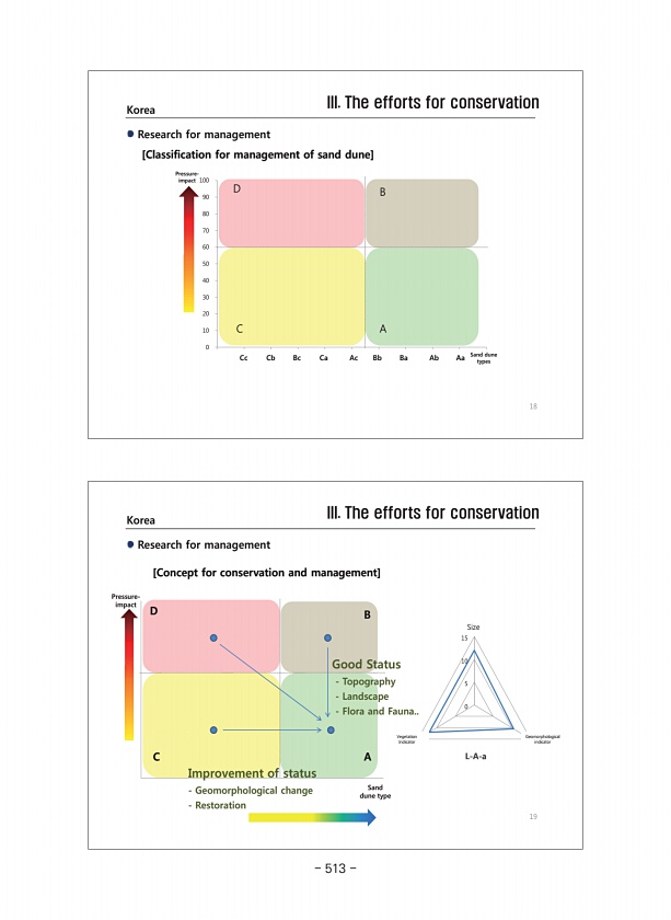 III. The efforts for conservation Korea Research for management [Concept for conservation and management] D Pressureimpact B Good Status Topography Landscape Flora and Fauna.. 10 15 사구기반 Size 19 C A Sand dune type Improvement of status Geomorphological change Restoration 5 0 사구역동 성 사구자연 성 L-A-a Vegetation Indicator Geomorphological indicator III. The efforts for conservation Korea Research for man...