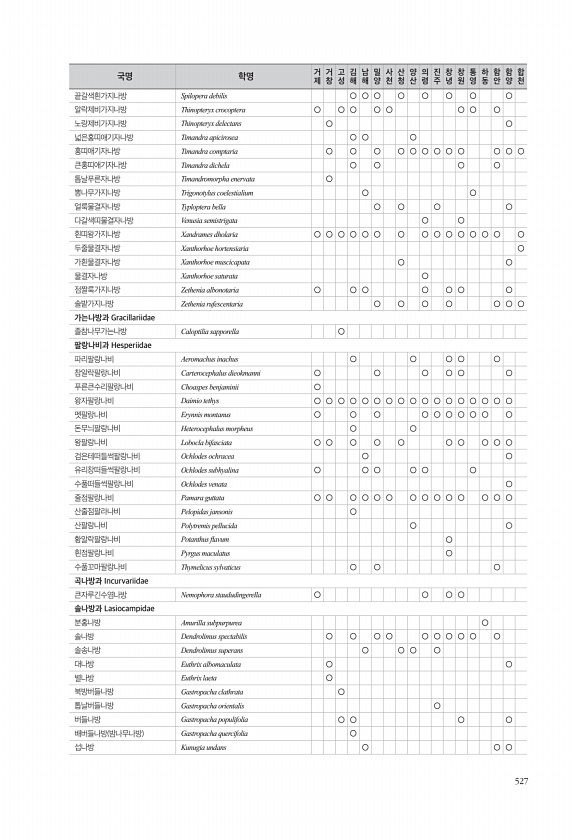 527 끝갈색흰가지나방 Spilopera debilis ○ ○ ○ ○ ○ ○ ○ ○ 알락제비가지나방 Thinopteryx crocoptera ○ ○ ○ ○ ○ ○ ○ ○ 노랑제비가지나방 Thinopteryx delectans ○ ○ 넓은홍띠애기자나방 Timandra apicirosea ○ ○ ○ 홍띠애기자나방 Timandra comptaria ○ ○ ○ ○ ○ ○ ○ ○ ○ ○ ○ ○ 큰홍띠애기자나방 Timandra dichela ○ ○ ○ ○ 톱날푸른자나방 Timandromorpha enervata ○ 뽕나무가지나방 Trigonotylus coelestialium ○ ○ 얼룩물결자나방 Typloptera bella ○ ○ ○ ○ 다갈색띠물결자나방 Venusia semistrigata ○ ○ 흰띠왕가지나방 ...