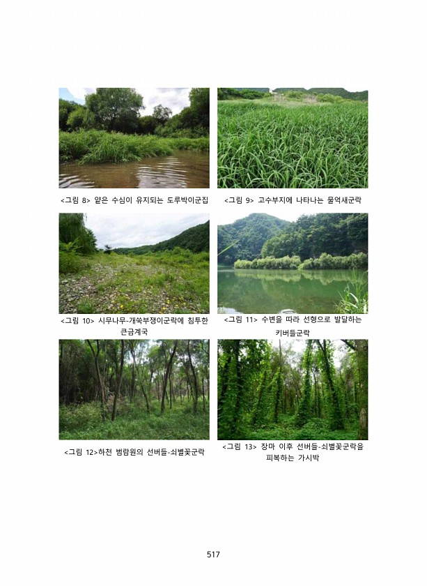 517 그림 8 얕은 수심이 유지되는 도루박이군집 그림 9 고수부지에 나타나는 물억새군락 그림 10 시무나무-개쑥부쟁이군락에 침투한 큰금계국 그림 11 수변을 따라 선형으로 발달하는 키버들군락 그림 12 하천 범람원의 선버들-쇠별꽃군락 그림 13 장마 이후 선버들-쇠별꽃군락을 피복하는가시박