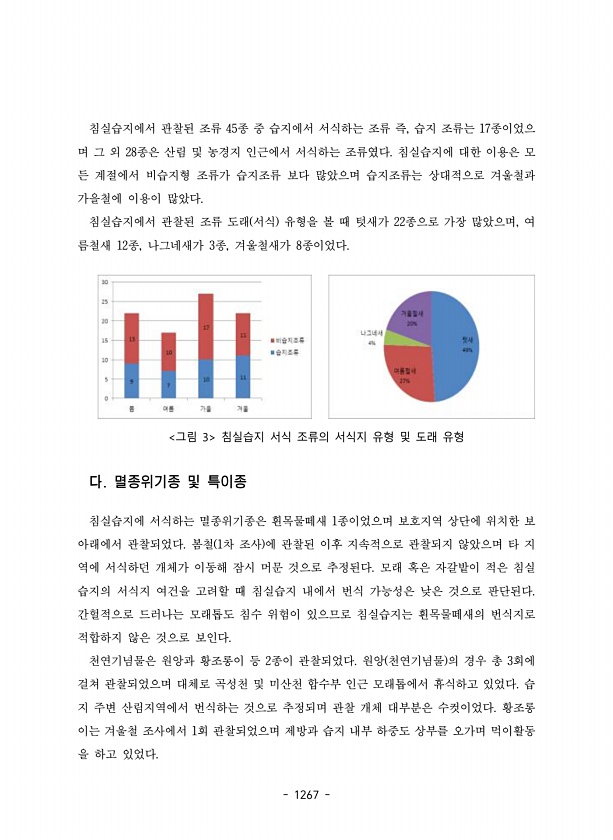 1267 침실습지에서 관찰된 조류 45종 중 습지에서 서식하는 조류 즉, 습지 조류는 17종이었으 며 그 외 28종은 산림 및 농경지 인근에서 서식하는 조류였다. 침실습지에 대한 이용은 모 든 계절에서 비습지형 조류가 습지조류 보다 많았으며 습지조류는 상대적으로 겨울철과 가을철에 이용이 많았다. 침실습지에서 관찰된 조류 도래 서식 유형을 볼 때 텃새가 22종으로 가장 많았으며, 여 름철새 12종, 나그네새가 3종, 겨울철새가 8종이었다. 그림 3 침실습지 서식 조류의 서식지 유형 및 도래 유형 다. 멸종위기종 및 특이종 침실습지에 서식하는 멸종위기종은 흰목물떼새 1종이었으며 보호지역 상단에 위치한 보 아래에서 관찰되었다. 봄철 1차 조사 에 관찰된 이후 지속적으로 관찰되지 않았으며 타 지 역에 서식하던 개체...