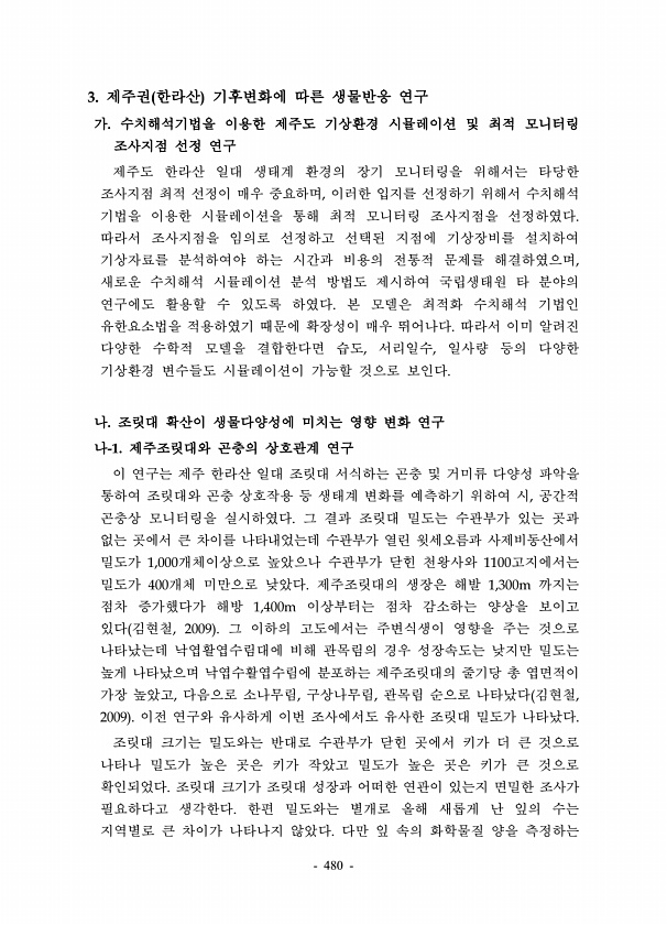 480 3. 제주권 한라산 기후변화에 따른 생물반응 연구 가. 수치해석기법을 이용한 제주도 기상환경 시뮬레이션 및 최적 모니터링 조사지점 선정 연구 제주도 한라산 일대 생태계 환경의 장기 모니터링을 위해서는 타당한 조사지점 최적 선정이 매우 중요하며, 이러한 입지를 선정하기 위해서 수치해석 기법을 이용한 시뮬레이션을 통해 최적 모니터링 조사지점을 선정하였다. 따라서 조사지점을 임의로 선정하고 선택된 지점에 기상장비를 설치하여 기상자료를 분석하여야 하는 시간과 비용의 전통적 문제를 해결하였으며, 새로운 수치해석 시뮬레이션 분석 방법도 제시하여 국립생태원 타 분야의 연구에도 활용할 수 있도록 하였다. 본 모델은 최적화 수치해석 기법인 유한요소법을 적용하였기 때문에 확장성이 매우 뛰어나다. 따라서 이미 알려진 다...