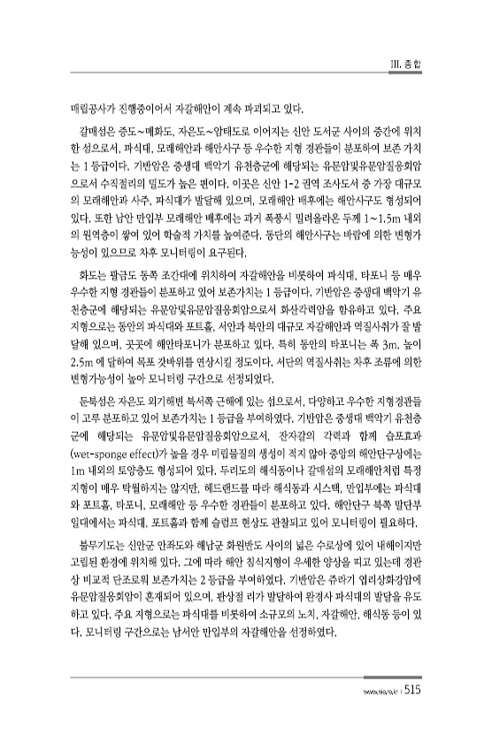 III. 종 합 www.nie.re.kr ?515 매립공사가 진행중이어서 자갈해안이 계속 파괴되고 있다. 갈매섬은 증도∼매화도, 자은도∼암태도로 이어지는 신안 도서군 사이의 중간에 위치 한 섬으로서, 파식대, 모래해안과 해안사구 등 우수한 지형 경관들이 분포하여 보존 가치 는 1 등급이다. 기반암은 중생대 백악기 유천층군에 해당되는 유문암및유문암질응회암 으로서 수직절리의 밀도가 높은 편이다. 이곳은 신안 1-2 권역 조사도서 중 가장 대규모 의 모래해안과 사주, 파식대가 발달해 있으며, 모래해안 배후에는 해안사구도 형성되어 있다. 또한 남안 만입부 모래해안 배후에는 과거 폭풍시 밀려올라온 두께 1∼1.5m 내외 의 원역층이 쌓여 있어 학술적 가치를 높여준다. 동단의 해안사구는 바람에 의한 변형가 능성이 있으...
