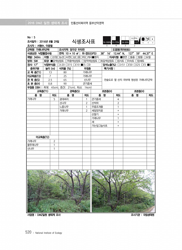 2016 DMZ 일원 생태계 조사 민통선이북지역 동부산악권역 520 ? National Institute of Ecology No 5 조사일자 2016년 8월 29일 조사자 서형수, 이응필 식생조사표 군락명가래나무군락 조사지역양구군 두타연 도엽명 격자번호 식생상관낙엽활엽수림 면적10 × 10 ㎡ 위·경도 GPS 38° 16′ 12.44″N, 127° 59′ 44.37″E 해발349m 지형□산정□능선□사면 □상□중□하 □계곡■평지 미세지형■평면 □돌출 □함몰 □요철 방위SW 토양■갈색삼림토 □적황색삼림토 □암적색삼림토 □회갈색삼림토 □침식토 □미숙토 □암쇄토 경사17° 낙엽부식층□≥20 □ 15 □ 10 ■ 5 □0 암석노출 % □≥51 □ 50 □ 25 □ 5 ■0 층위구분 높이 m 식피율 % 우점종 특기사...