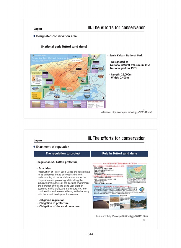 III. The efforts for conservation Japan The regulation to protect Rule in Tottori sand dune [Regulation 64, Tottori prefecture] ? Basic idea ? Obligation regulation Obligation in prefecture Obligation of the sand dune user Preservation of Tottori Sand Dunes and revival have to be performed based on cooperating with understanding of the sand dune user under the cooperation and promoting while takin...