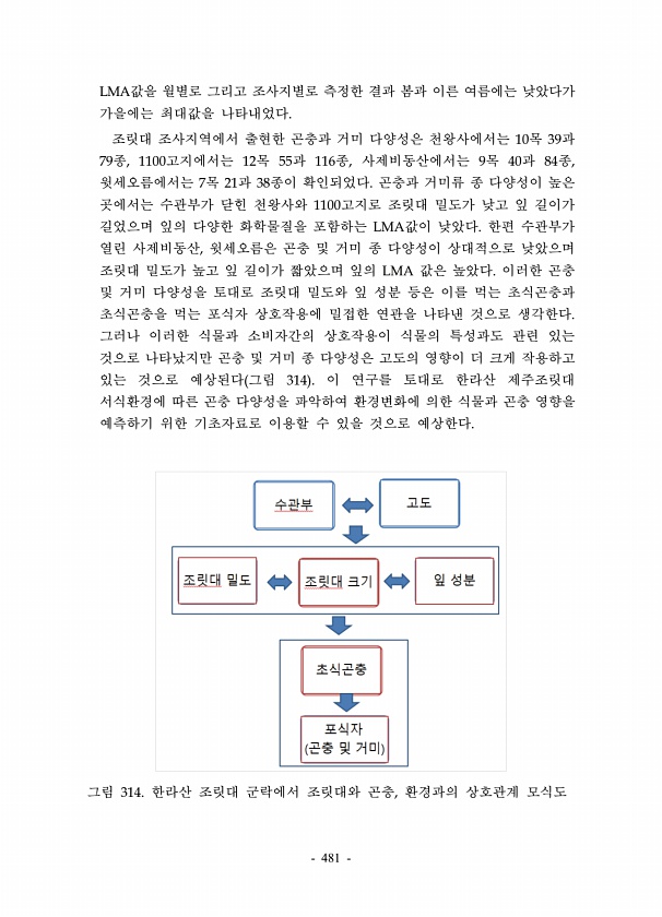 481 LMA값을 월별로 그리고 조사지별로 측정한 결과 봄과 이른 여름에는 낮았다가 가을에는 최대값을 나타내었다. 조릿대 조사지역에서 출현한 곤충과 거미 다양성은 천왕사에서는 10목 39과 79종, 1100고지에서는 12목 55과 116종, 사제비동산에서는 9목 40과 84종, 윗세오름에서는 7목 21과 38종이 확인되었다. 곤충과 거미류 종 다양성이 높은 곳에서는 수관부가 닫힌 천왕사와 1100고지로 조릿대 밀도가 낮고 잎 길이가 길었으며 잎의 다양한 화학물질을 포함하는 LMA값이 낮았다. 한편 수관부가 열린 사제비동산, 윗세오름은 곤충 및 거미 종 다양성이 상대적으로 낮았으며 조릿대 밀도가 높고 잎 길이가 짧았으며 잎의 LMA 값은 높았다. 이러한 곤충 및 거미 다양성을 토대로 조릿대 밀도와 잎 성분 등...