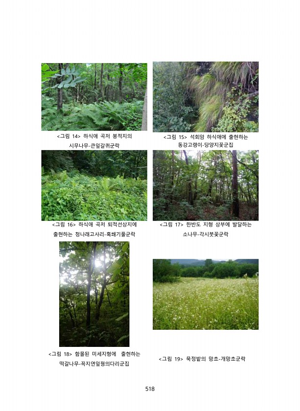 518 그림 14 하식애 곡저 붕적지의 시무나무-큰잎갈퀴군락 그림 15 석회암 하식애에 출현하는 동강고랭이-당양지꽃군집 그림 16 하식애 곡저 퇴적선상지에 출현하는 청나래고사리-혹쐐기풀군락 그림 17 한반도 지형 상부에 발달하는 소나무-각시붓꽃군락 그림 18 함몰된 미세지형에 출현하는 떡갈나무-꼭지연잎꿩의다리군집 그림 19 묵정밭의망초-개망초군락
