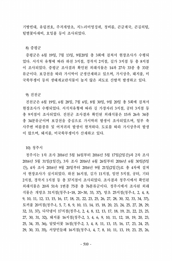 510 기땅빈대, 유럽전호, 주걱개망초, 지느러미엉겅퀴, 청비름, 큰금계국, 큰김의털, 털별꽃아재비, 호밀풀 등이 조사되었다. 8 증평군 증평군은 6월 19일, 7월 13일, 9월20일 총 3회에 걸쳐서 현장조사가 수행되 었다. 서식처 유형에 따라 하천 3지점, 경작지 2지점, 길가 3지점 등 총 8지점 이 조사되었다. 증평군 조사결과 확인된 외래식물은 14과 27속 33종 총 33분 류군이다. 보강천을 따라 가시박이 군생산재하고 있으며, 가시상추, 돼지풀, 미 국쑥부쟁이 등의 생태계교란식물이 높지 않은 피도로 산발적 발생하고 있다. 9 진천군 진천군은 6월 19일, 6월 28일, 7월 6일, 8월 30일, 9월 20일 총 5회에 걸쳐서 현장조사가 수행되었다. 서식처유형에 따라 길 가장자리 3지점, 공터 3...