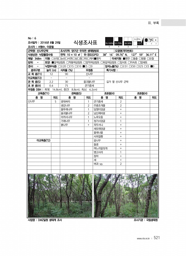 Ⅲ. 부록 www.nie.re.kr ? 521 No 6 조사일자 2016년 8월 29일 조사자 서형수, 이응필 식생조사표 군락명신나무군락 조사지역양구군 두타연 생태탐방로 도엽명 격자번호 식생상관낙엽활엽수림 면적10 × 10 ㎡ 위·경도 GPS 38° 16′ 09.76″N, 127° 59′ 36.11″E 해발348m 지형□산정□능선□사면 □상□중□하 □계곡■평지 미세지형■평면 □돌출 □함몰 □요철 방위토양■갈색삼림토 □적황색삼림토 □암적색삼림토 □회갈색삼림토 □침식토 □미숙토 □암쇄토 경사낙엽부식층□≥20 □ 15 □ 10 ■ 5 □0 암석노출 % □≥51 □ 50 □ 25 □ 5 ■0 층위구분 높이 m 식피율 % 우점종 특기사항 교 목 층 T1 12 90 신나무 길가 옆 신나무 군락 아교목층 T2 관 목 층...