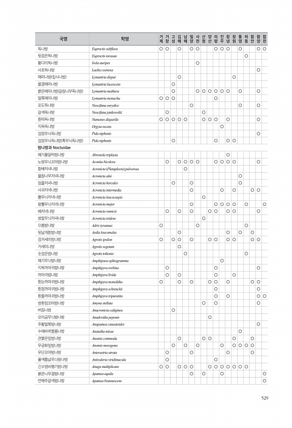 529 독나방 Euproctis subfava ○ ○ ○ ○ ○ ○ ○ ○ ○ ○ ○ 뒷검은독나방 Euproctis torasan ○ 황다리독나방 Ivela auripes ○ 사초독나방 Laelia coenosa ○ 매미나방 짚시나방 Lymantria dispar ○ ○ 물결매미나방 Lymantria lucescens ○ 붉은매미나방 갈참나무독나방 Lymantria mathura ○ ○ ○ ○ ○ ○ ○ ○ ○ 얼룩매미나방 Lymantria monacha ○ ○ ○ ○ 포도독나방 Neocifuna eurydice ○ ○ ○ 갈색독나방 Neocifuna jankowskii ○ ○ 흰띠독나방 Numenes disparilis ○ ○ ○ ○ ○ ○ ○ ○ ○ ○ 지옥독나방 Orgyia recens ○ 검정무늬독나...